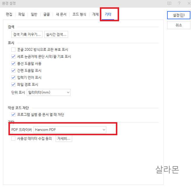 2. 기타 탭 으로 들어가서, 아래의 기타 부분에 PDF드라이버가 Hancom PDF로 되어있을 것이다.