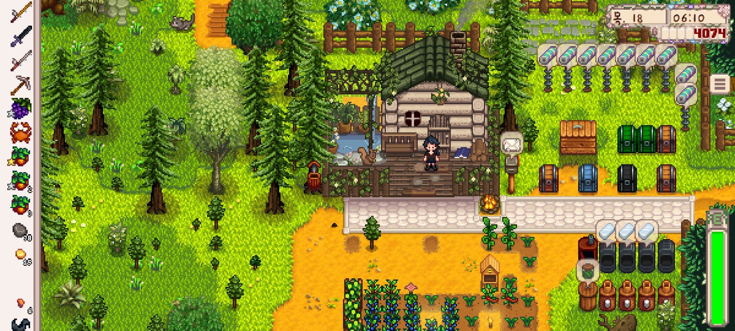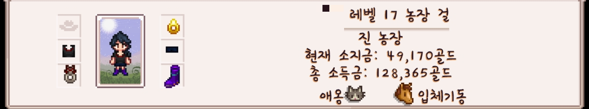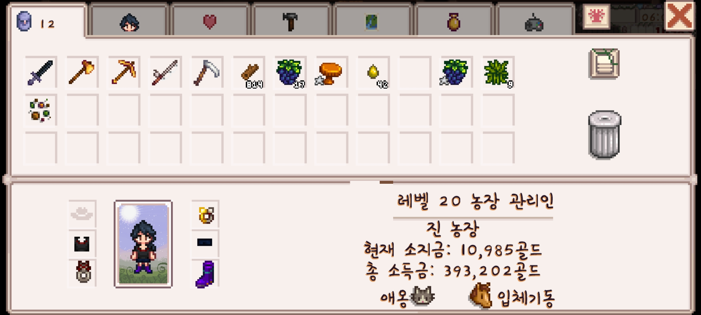 - 농사 6, 채광 4, 채집 5, 낚시 5, 전투 2 레벨링