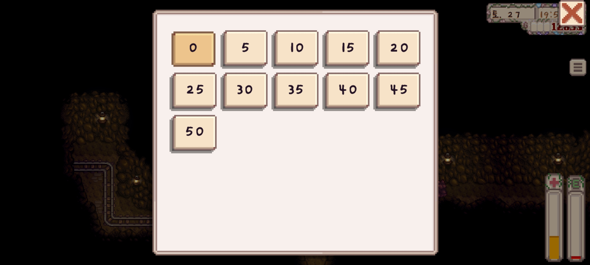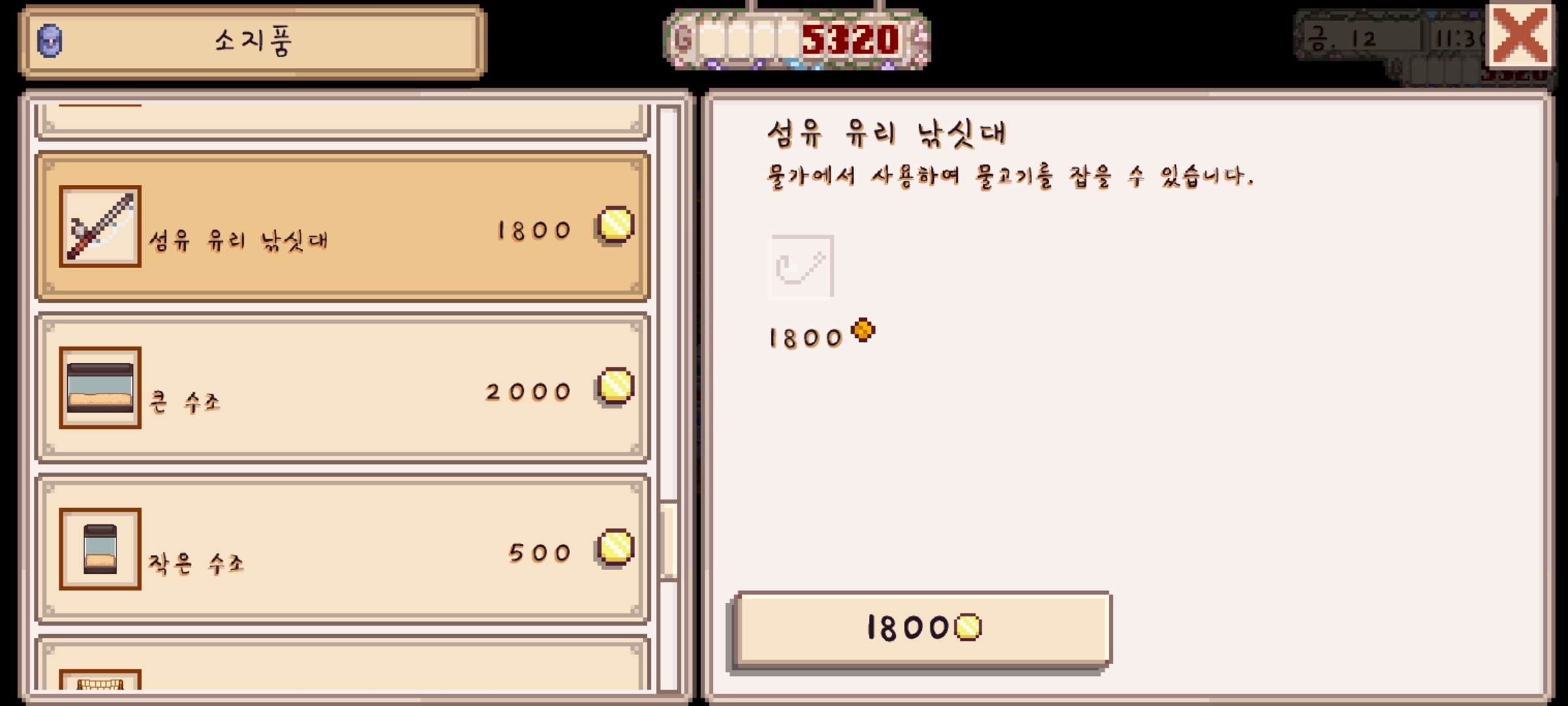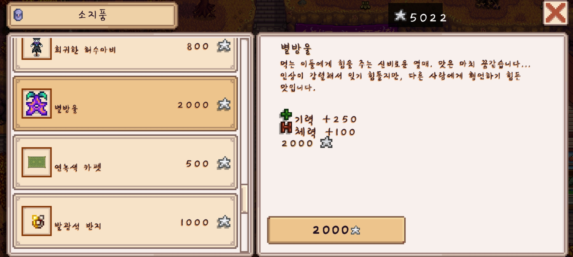 - 농사 6, 채광 4, 채집 5, 낚시 5, 전투 2 레벨링