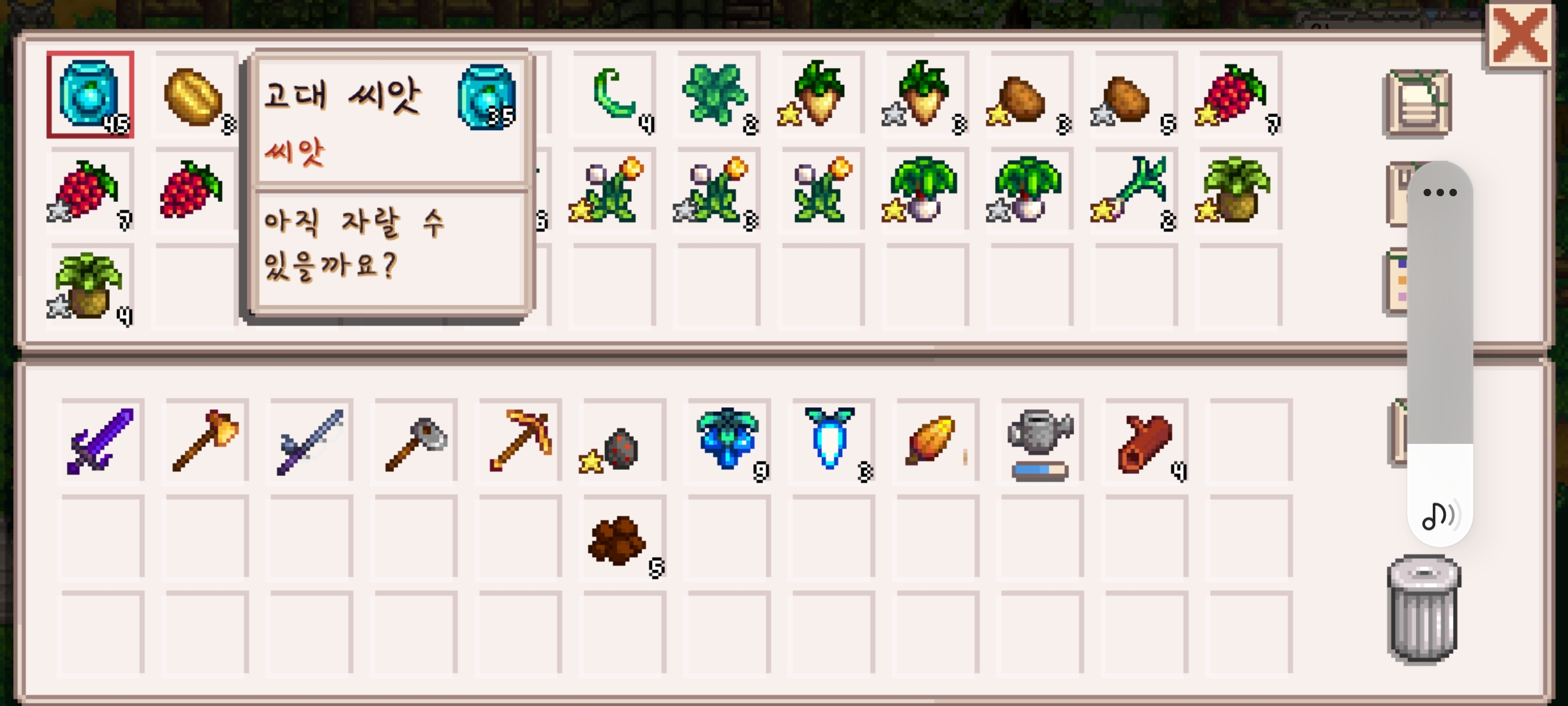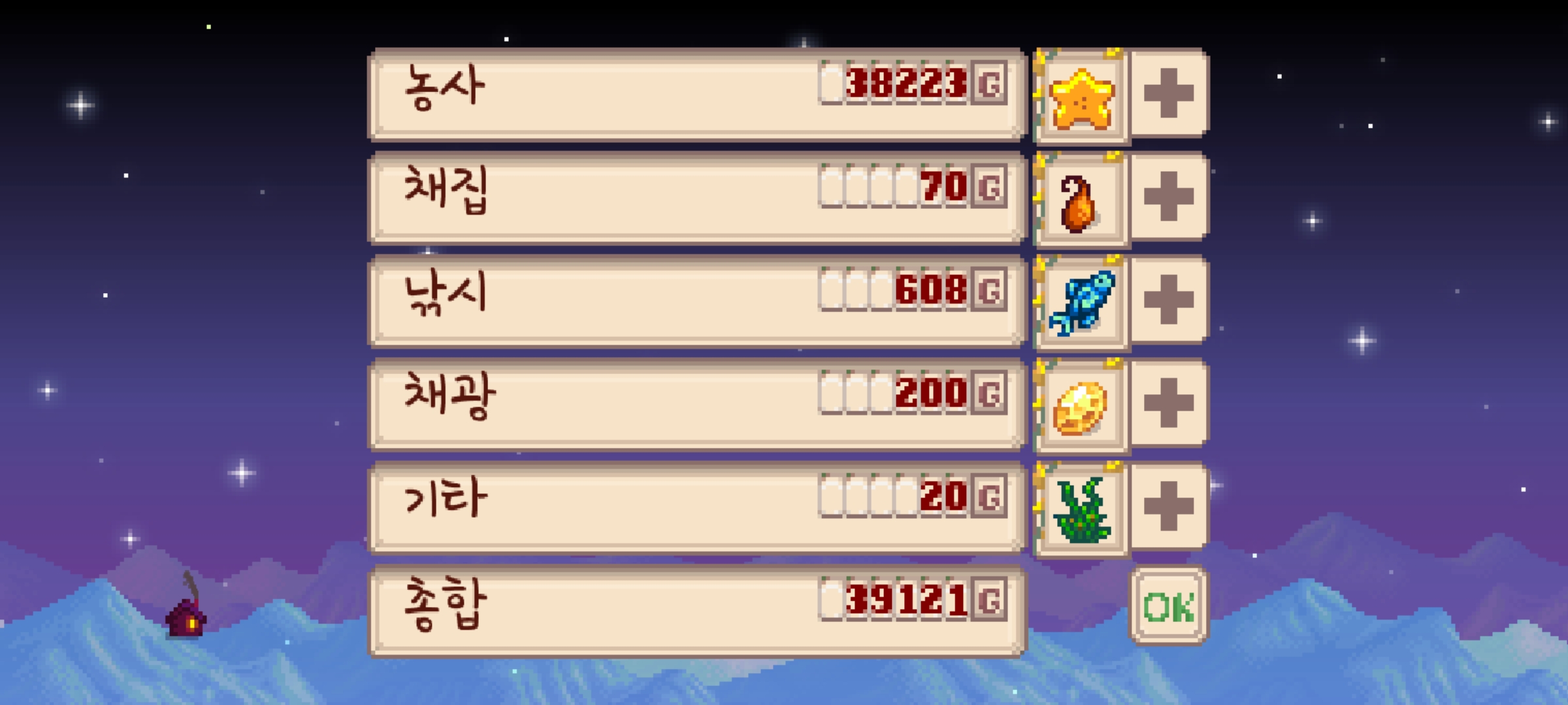 - 농사 9, 채광 7, 채집 7, 낚시 6, 전투 5 레벨링