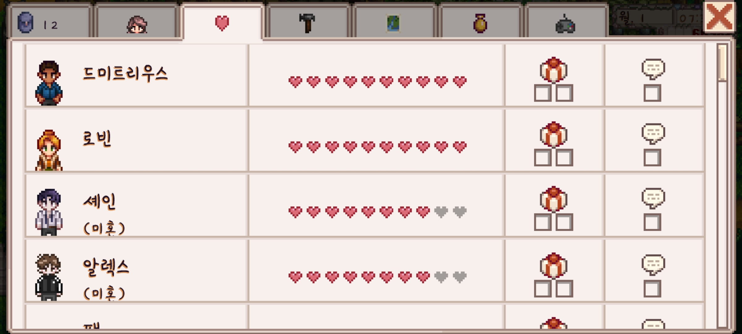 - 대부분의 주민 호감도 풀로 채우거나 7 이상