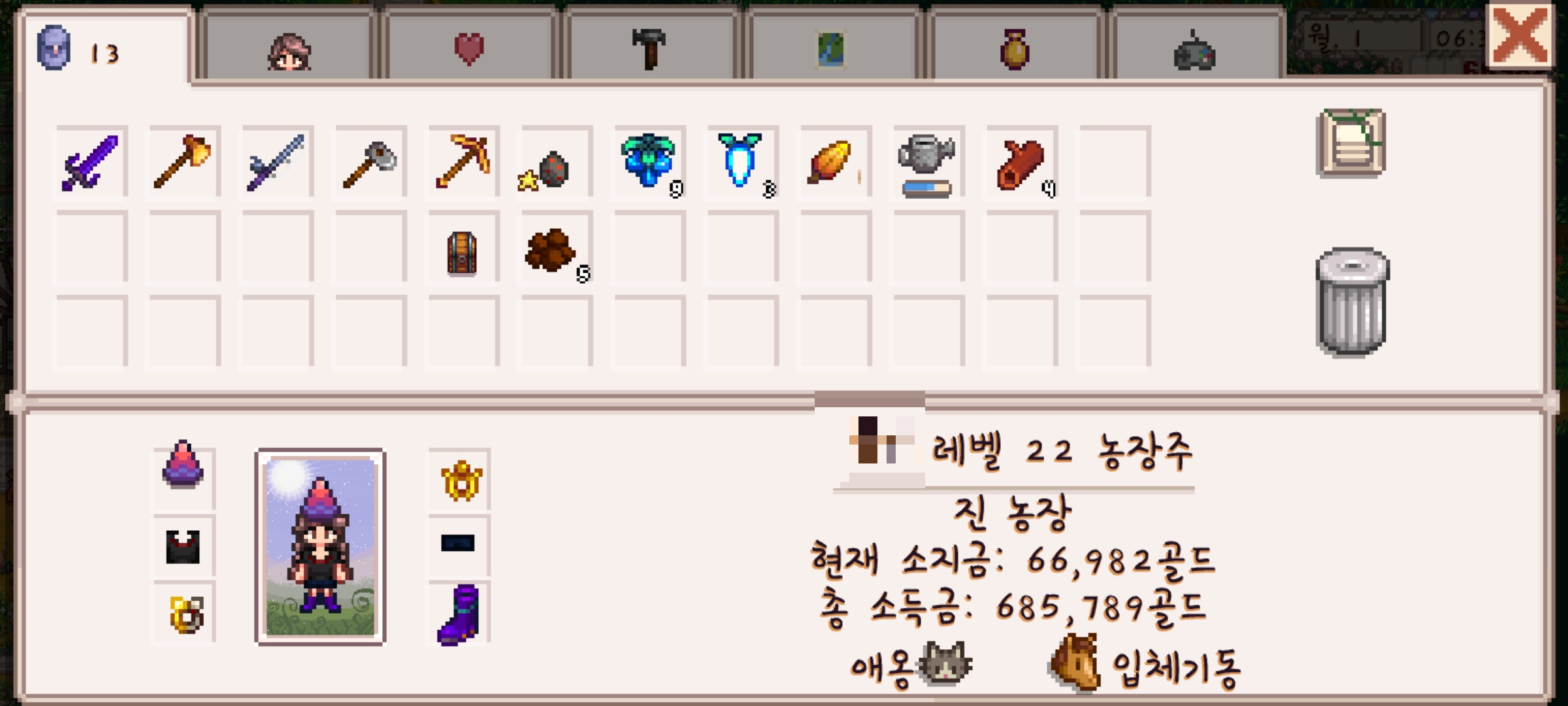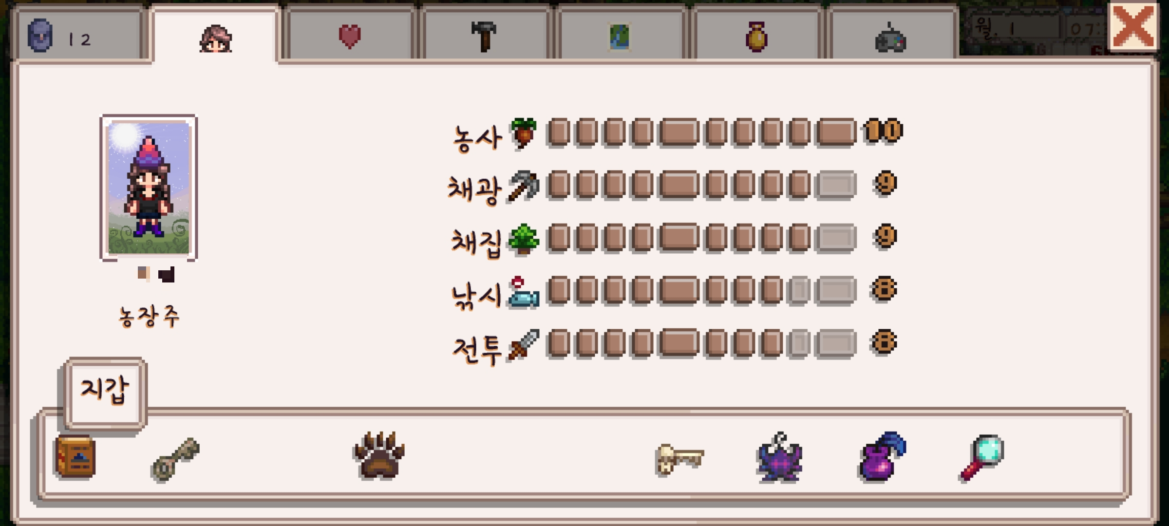 - 농사 10, 채광 8, 채집 9, 낚시 7, 전투 6 레벨링