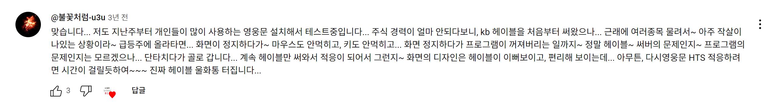 아무래도 익명 사이트가 많고, 본인이 투자하다가 손실이 나는 경우 본인이 사용하는 HTS에 대해서도 부정적인 의견을 남기는 경우가 많아서로 보입니다. 따라서 몇몇 의견은 수용하되, 직접 본인이 HTS를 깔아서 써보거나 유튜브에서 영상을 보고 판단하는 것이 좋아보입니다.