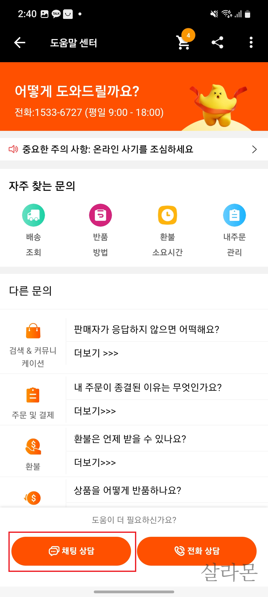 알리 고객센터 환불은 엄청 쉽고 빠르다.