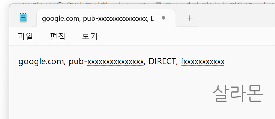아래 나와 있는 "google.com, pub-xxxxxxxxxxxxxxx, DIRECT, fxxxxxxxxxxx" 를 복사한다.