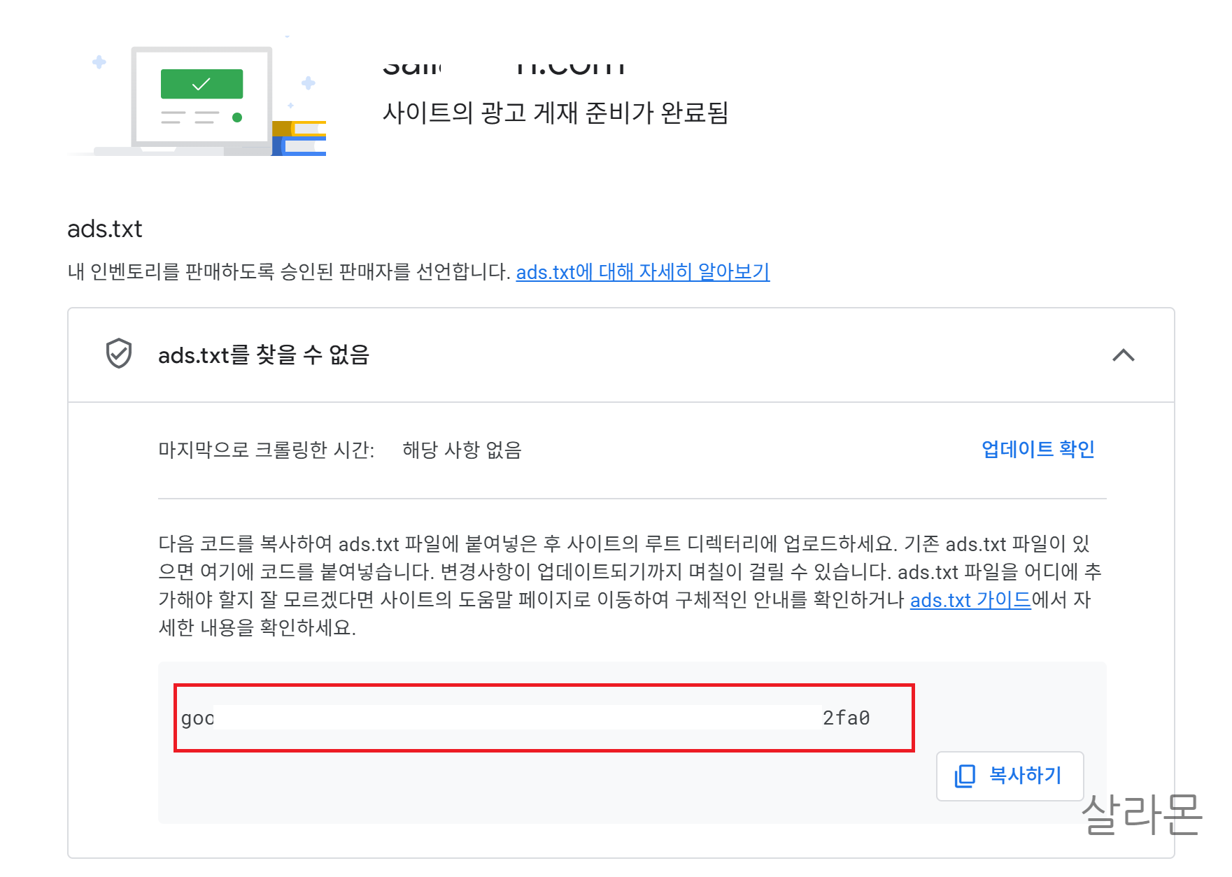1. Ads.txt 상태가 '찾을 수 없음'인 사이트를 클릭해주면, 위와 같은 화면이 뜬다.