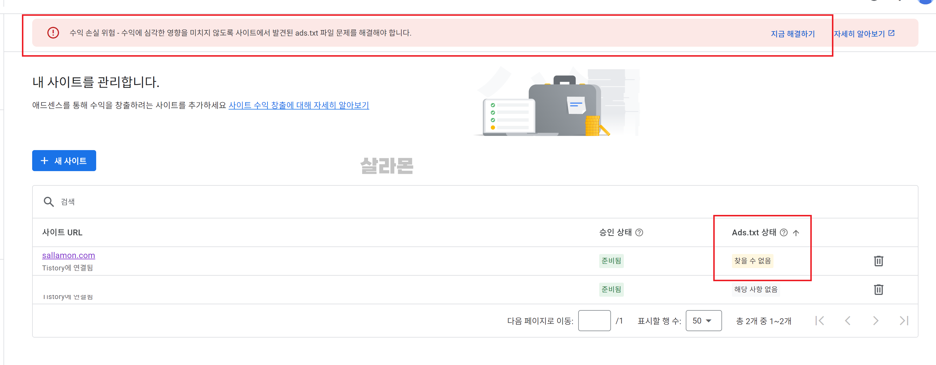 애드센스 승인까지는 문제 없이 받았는데, "수익 손실 위험 - 수익에 심각한 영향을 미치지 않도록 사이트에서 발견된 ads.txt 파일 문제를 해결해야 합니다." 라는 경고 멘트가 상단에 떴다.
