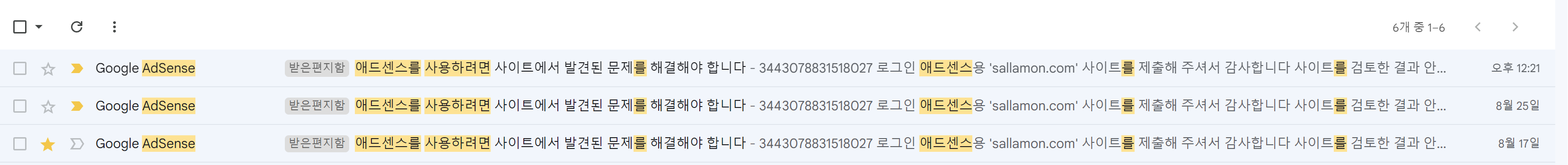 이전 블로그에서 네 번째만에 애드센스 승인이 났을 때, 게시글이 30개가 넘었던 것으로 기억한다. 계속 열심히 양질의 글을 쓰다보면 이 부분 문제는 자연스레 해결되리라고 본다.