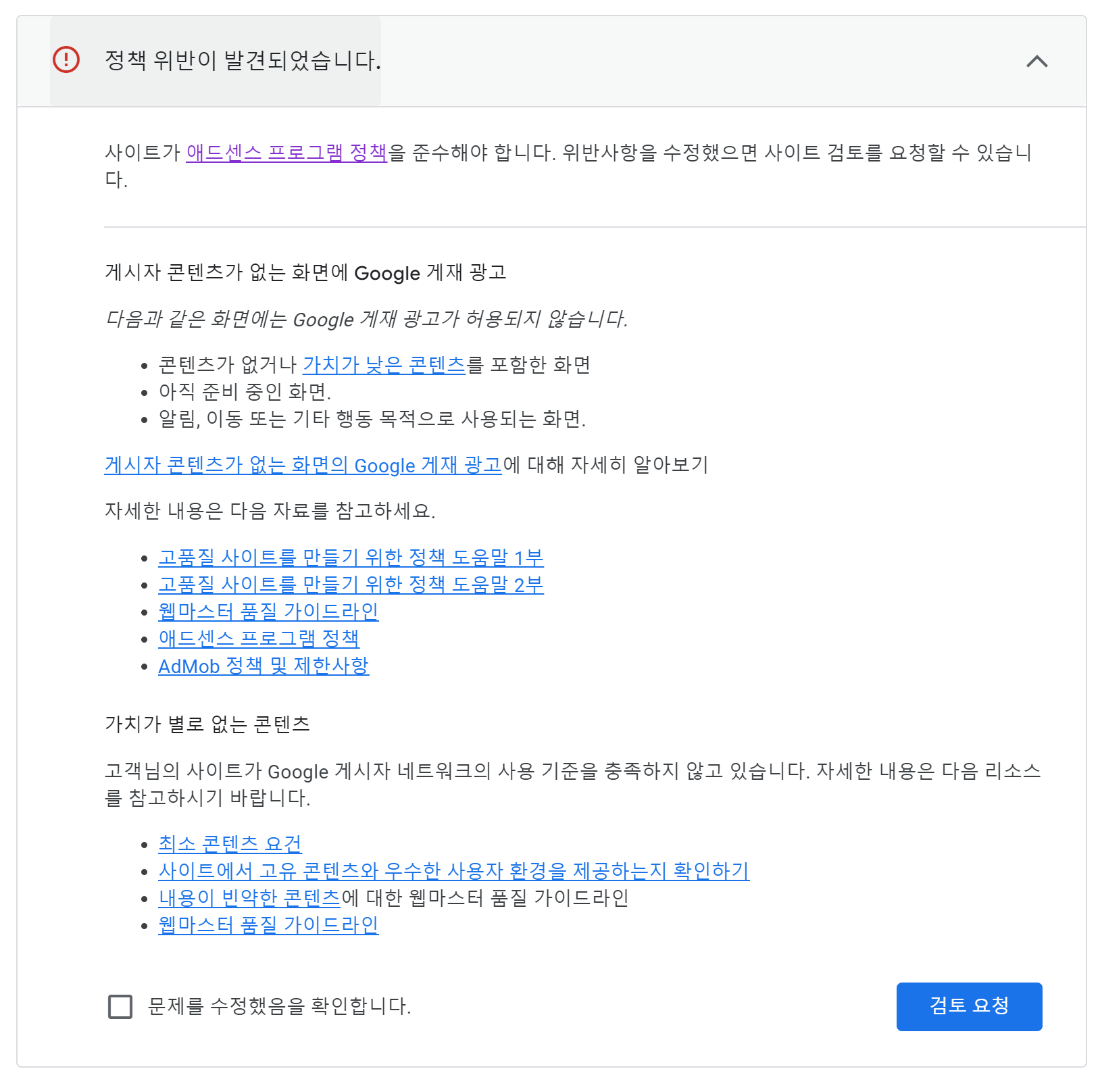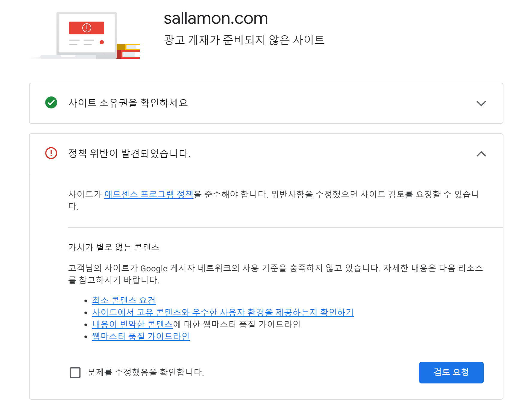 메일을 클릭하고 애드센스 사이트로 들어가보면 어떤 부분으로 반려가 되었는지 자세히 나온다.