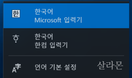 1. 작업표시줄 오른쪽 아래쪽에 '한' 혹은 'ㅎ'으로 표시된 입력모드 클릭 - 추가 키보드 설정 클릭