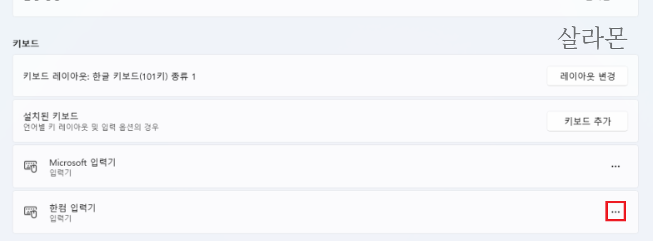 이제 키보드 - 한컴 입력기 쪽에서 점 세개를 누르고 '제거'를 누르면 끝입니다.