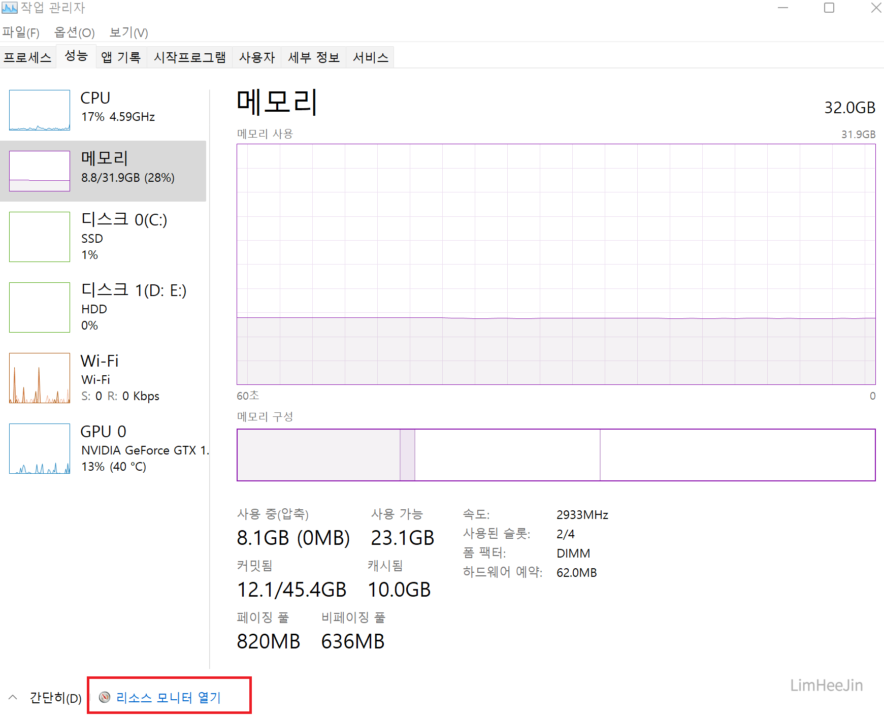 작업관리자를 열어서 성능 탭으로 가면 아래처럼 리소스 모니터 열기가 있다.