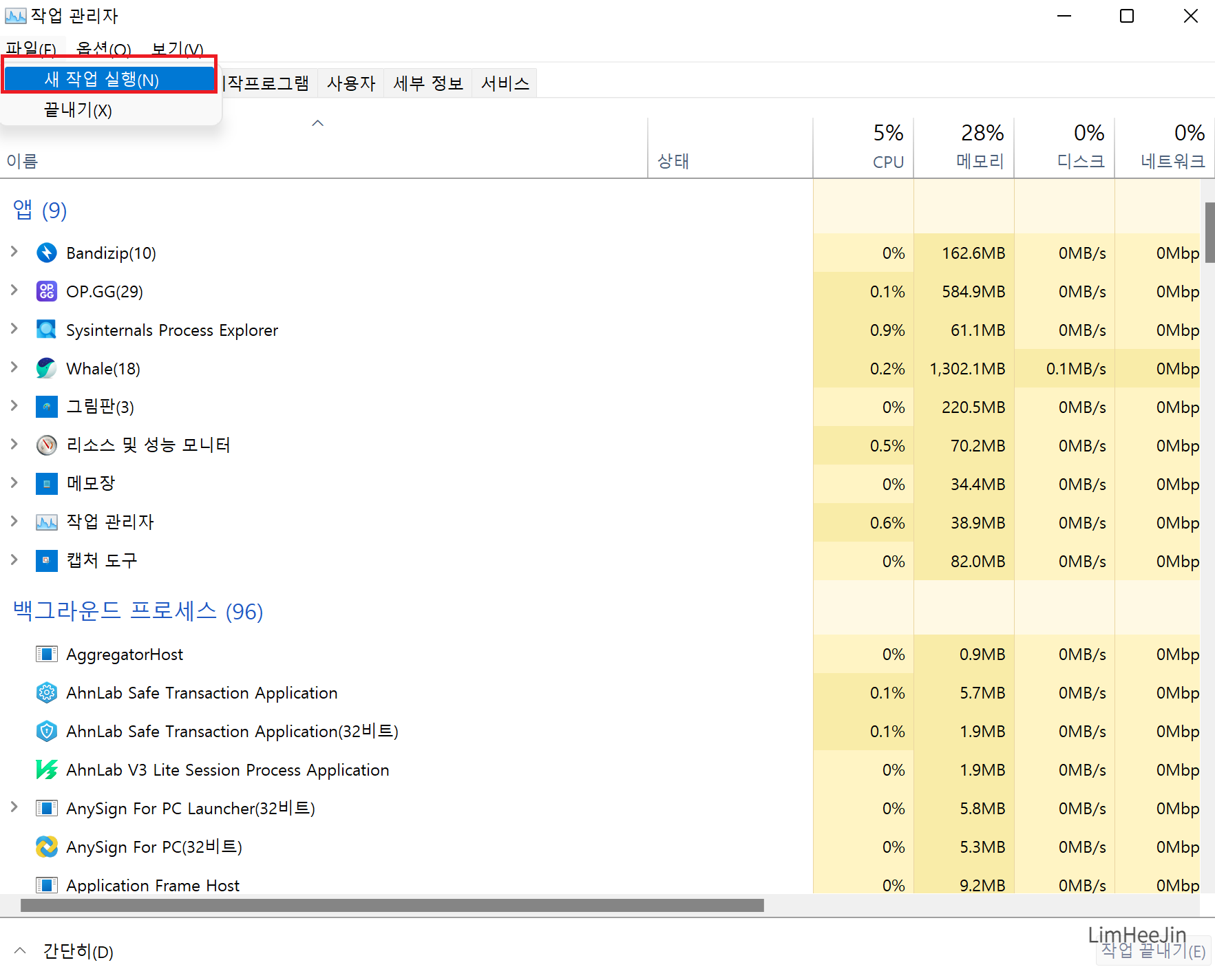 먼저 ctrl + alt + delete로 작업관리자를 실행하고,