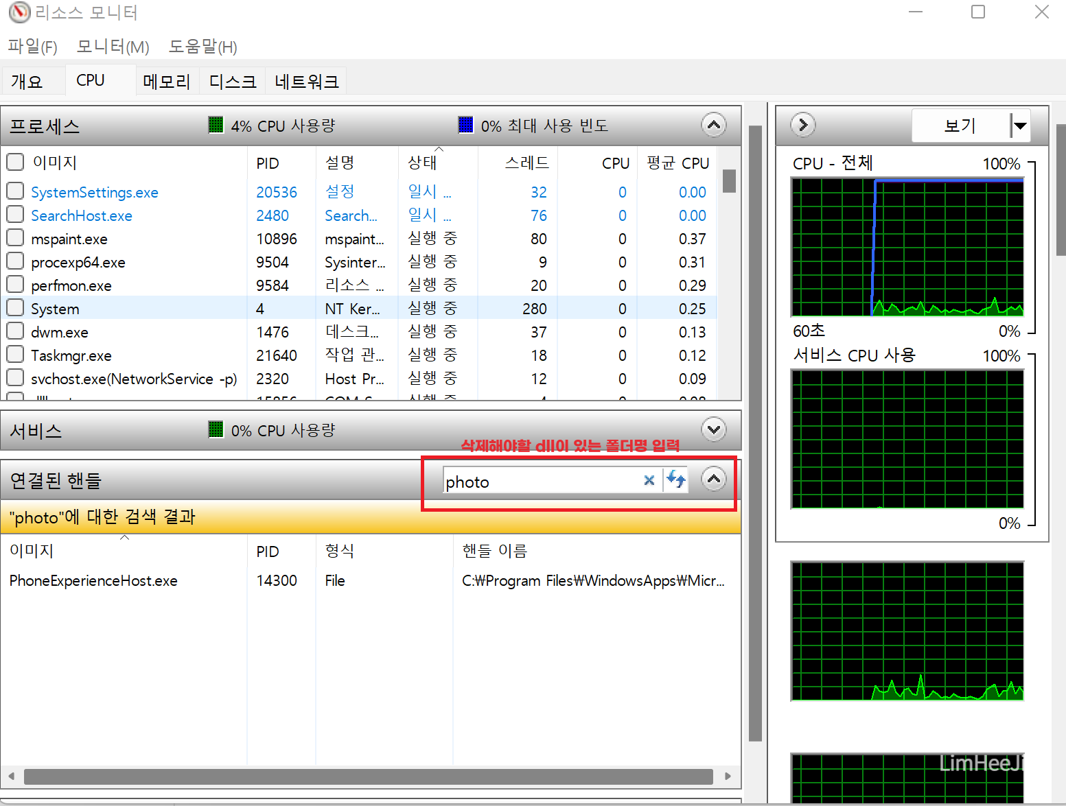 'CPU' 탭으로 이동해서 - '연결된 핸들'쪽에 삭제하고 싶은 dll이 있는 폴더명을 정확히 입력하면