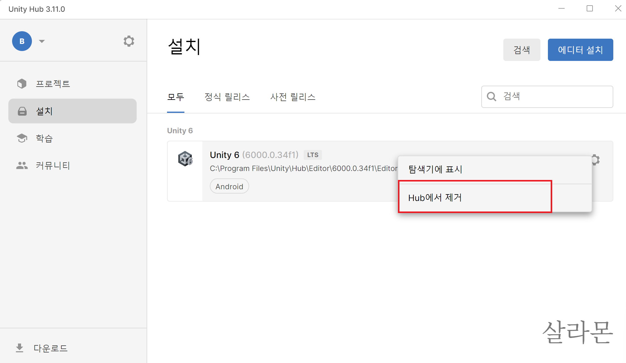 유니티 허브에 나와있는 프로그램 파일 경로로 들어가서 폴더를 직접 삭제했다)