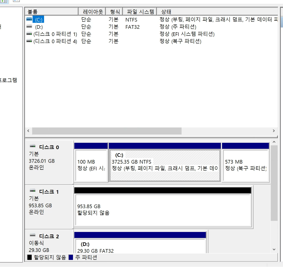 - 컴퓨터 관리 - 디스크 관리 - 디스크 할당/파티션 나누기 원하는 거 선택 후 진행