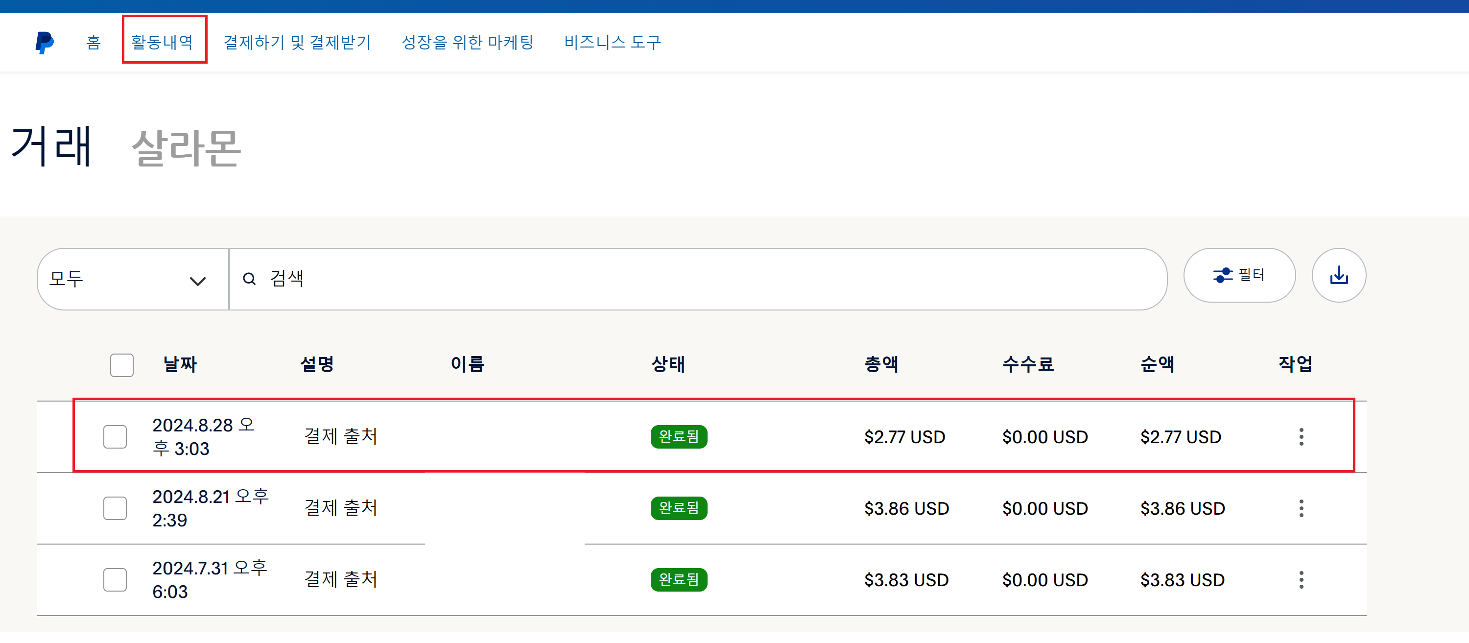 우선 페이팔로 접속하고 로그인 한 뒤, 페이지 상단의 활동내역을 클릭합니다.