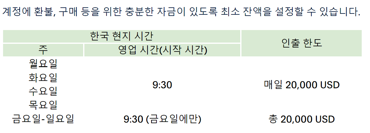 - 하루 최대 20,000 USD에 해당하는 인출 한도가 적용