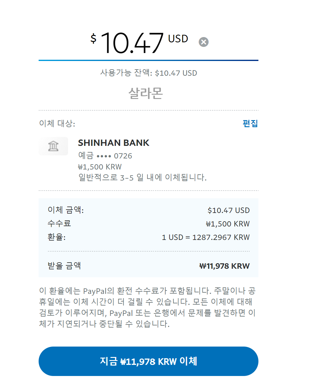 현재 제 페이팔 계좌에 있는 10.47달러를 한국으로 이체하려고 하니,