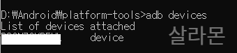 4. 해당 경로로 이동했다면 adb devices라는 명령어를 입력해준다.