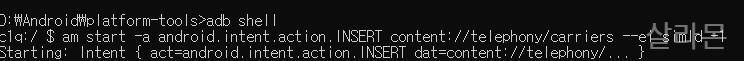 대충 말하자면 액티비티 매니저(am)을 시작(start) 하고, 동작을 지정하는데(-a) 기본 삽입 액션(android.intent.action.INSERT)을 수행할 것이고, 콘텐트 프로바이더(content://:) 중에서 APN을 관리하는 콘텐트 프로바이더(telephony/carriers)를 지정할 건데, Extra Integer 데이터인(--ei) 추가하려는 APN의 SIM ID를 설정한다는 것이다.
