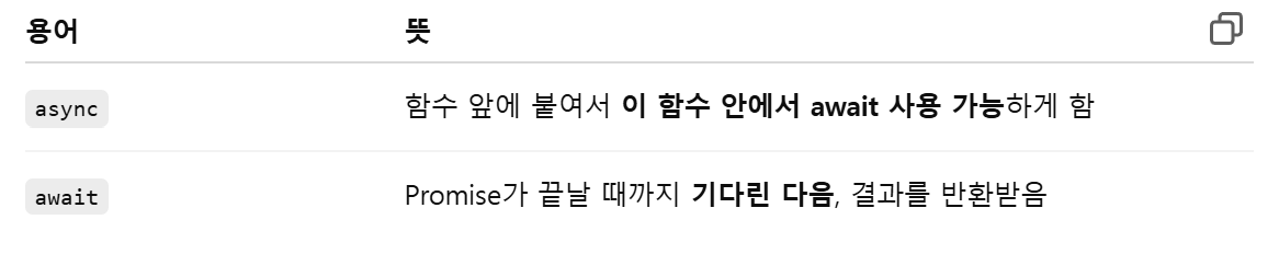 - 비동기 작업(asynchronous)을 동기처럼 읽기 쉽게 만드는 문법