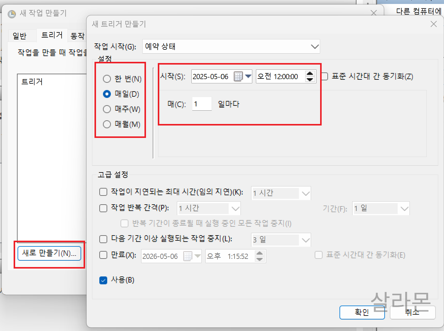 - 새로 만들기를 클릭 후, 본인이 만들고 싶은 주기마다 설정