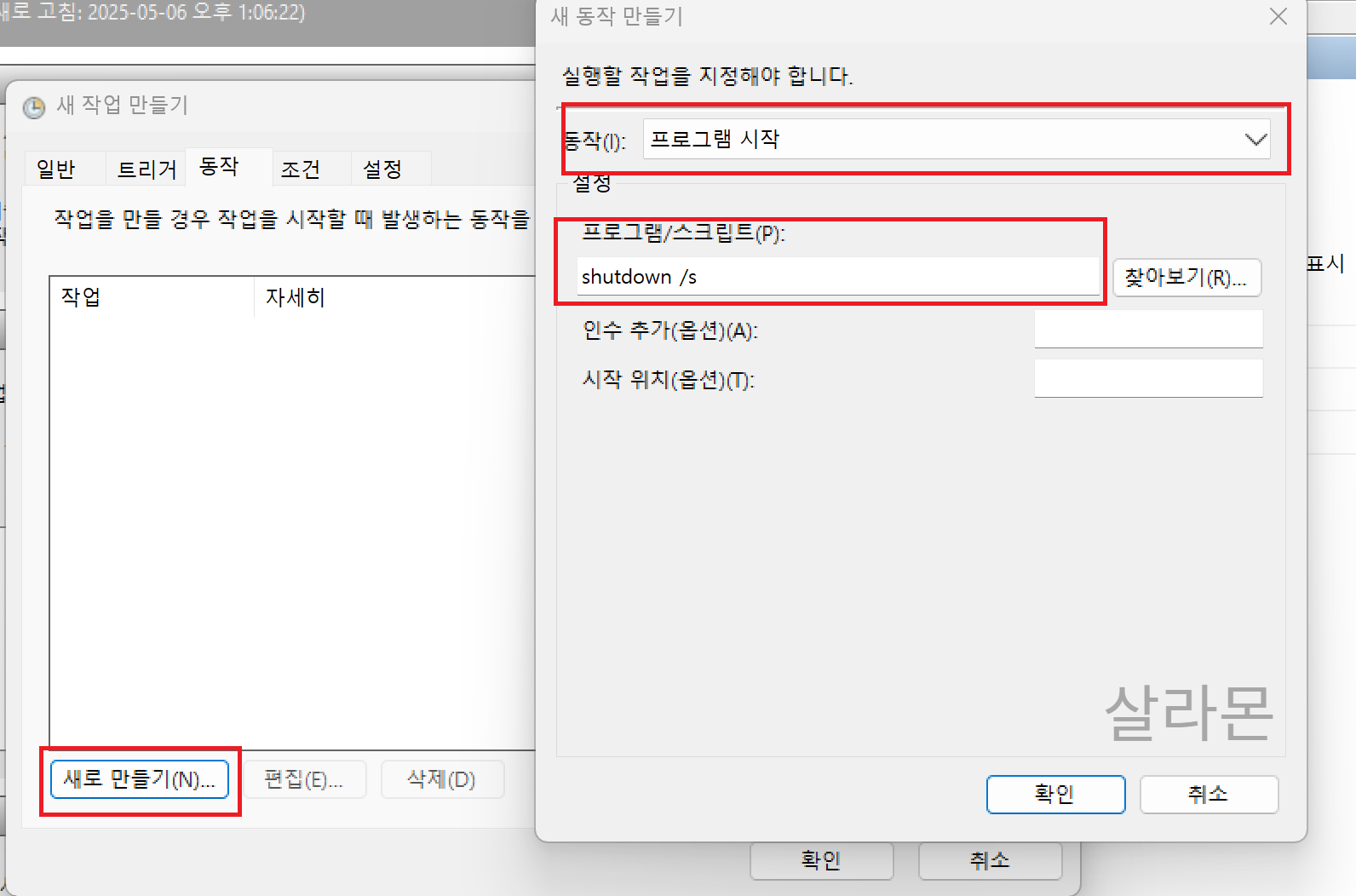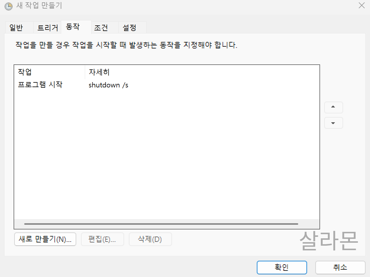 - 동작 탭에서 새로 만들기 클릭 후, 프로그램/스크립트 란에 shutdown을 적어줍니다.