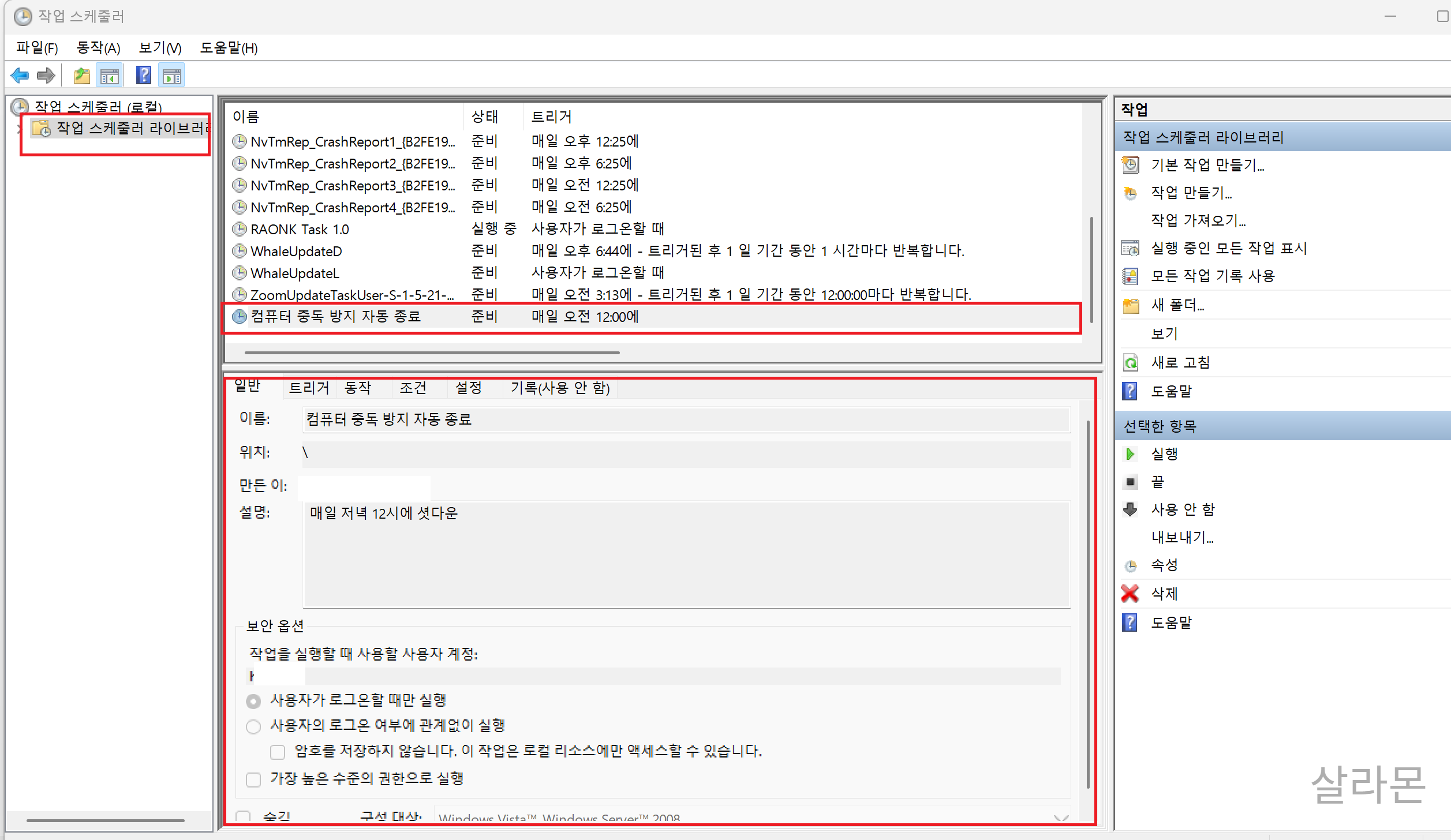 왼쪽 작업 스케줄러 라이브러리를 누르고 스크롤을 내리면 이제 본인이 만든 스케줄러가 보입니다.